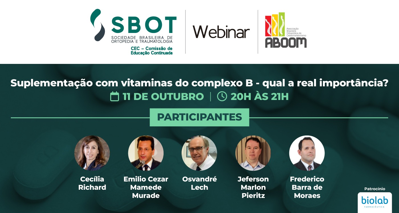 No dia 11 de outubro, terça-feira, das 20h às 21h, a Comissão de Educação Continuada da SBOT (CEC-SBOT) em parceria com o Comitê Ortopédico de Osteometabolismo (ABOOM), farão o terceiro encontro deste ano com o tema: Suplementação com vitaminas do complexo B: qual a real importância?