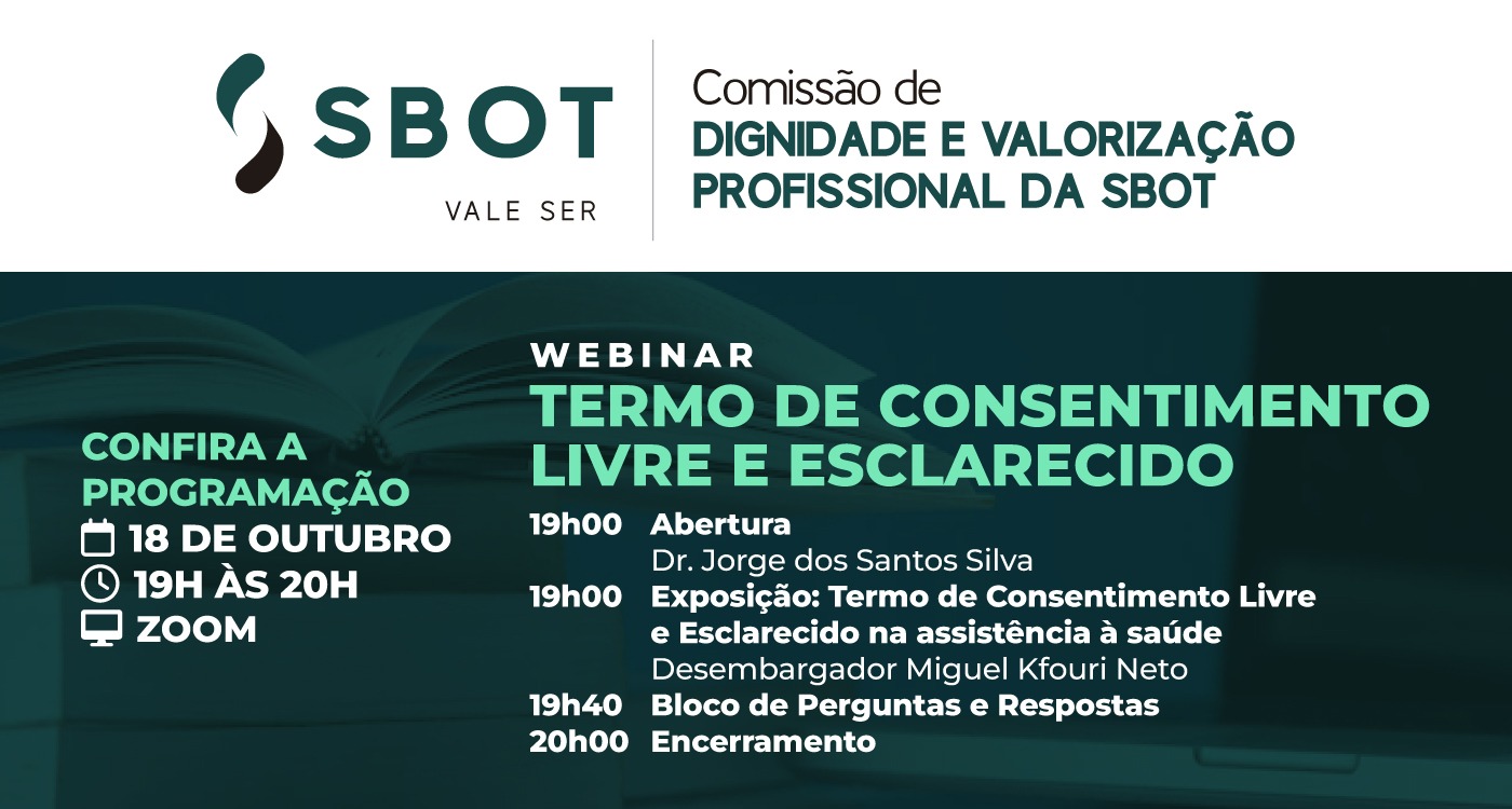 De maneira inédita, a Comissão de Dignidade e Valorização Profissional da Sociedade Brasileira de Ortopedia e Traumatologia – SBOT apresentará no dia 18 de outubro, das 19h às 20h, um webinar sobre Termo de consentimento livre e esclarecido na assistência à saúde.