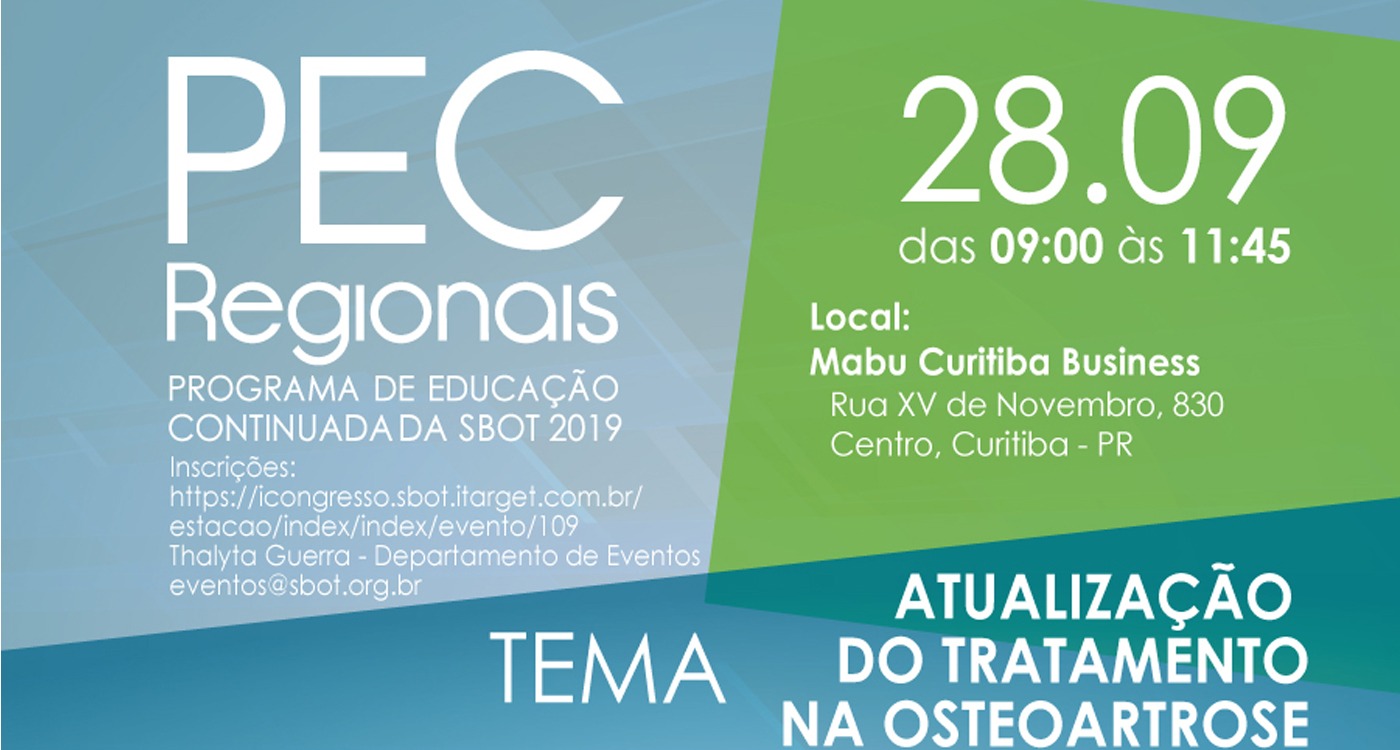 No dia 28 de setembro, das 09h às 12h no espaço Mabu Curitiba Business será realizado mais um Programa de Educação Continuada (PEC) organizado pela SBOT. O tema central do encontro é: Atualização do Tratamento na Osteoartrose.