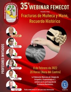 A Federação Mexicana de Colégios de Ortopedia e Traumatologia A.C – FEMECOT realizará amanhã, 8 de fevereiro, às 20h do México, seu 35º webinar para abordar o tema: “Fracturas de Muñeca y Mano, Recuerdo Histórico”.