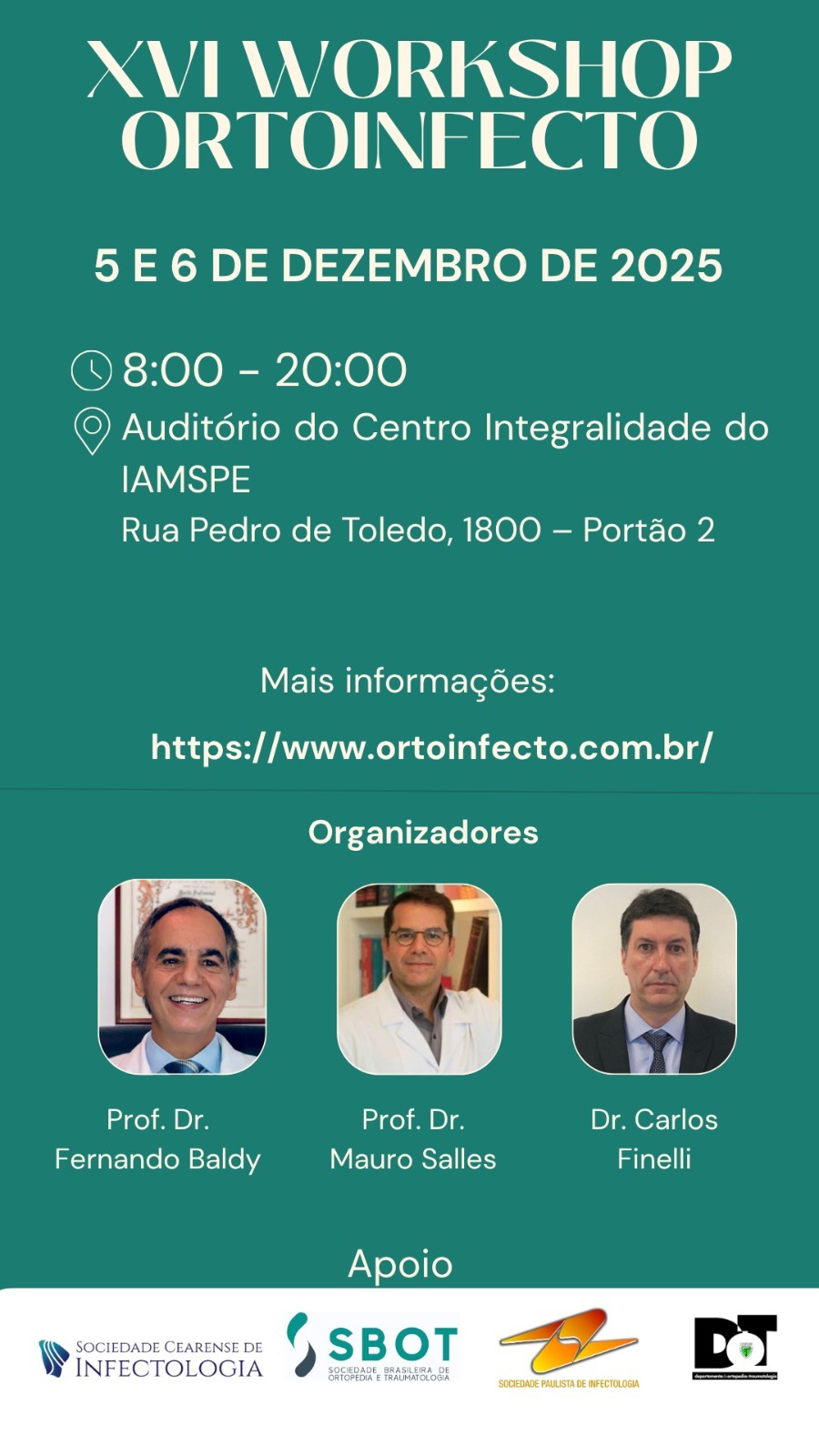 O evento aborda temas atualizados sobre prevenção, diagnóstico e tratamentos modernos das Infecções associadas às fraturas, Artroplastias infectadas e Osteomielites. Serão apresentados resultados do ICM (International Consensus Meeting) 2025 e do EBJIS (European Bone and Joint Infection Society Meeting) 2025.
