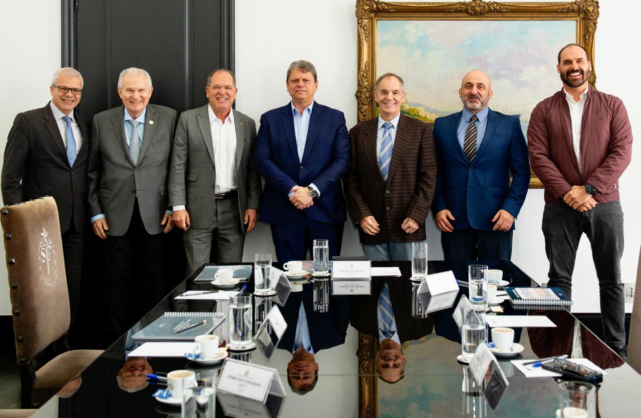 Nesta segunda-feira, 19 de agosto, a SBOT foi recebida pelo governador de São Paulo, Tarcísio de Freitas, em audiência privada no Palácio dos Bandeirantes, sede do Governo Paulista, com presença do deputado federal, Eduardo Bolsonaro. A pauta do encontro foi a proposta de parceria com o Governo do Estado para implementação de projetos futuros na área de Educação Médica Continuada em Ortopedia e Traumatologia, com destaque para o futuro Centro de Treinamento da SBOT, projeto que englobará um espaço de treinamento completo para realização de eventos e cursos educacionais, como cadáver lab.